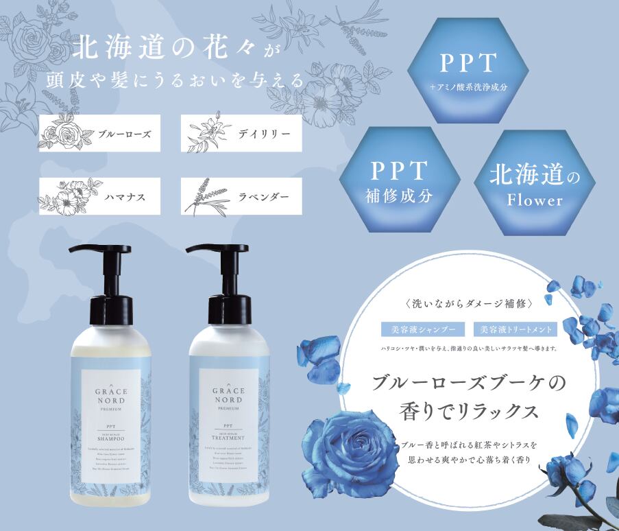 北海道の厳選素材などで髪をしっとり保湿し、スカルプケア成分で頭皮を健やかに。
